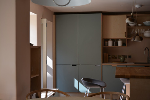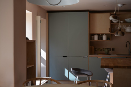 The new front utility extension is built from locally sourced, hand-knapped flint, laid in wild coursing to complement the humble cobble façade of the original cottage. Inside, exposed timber rafters and a rooflight bring warmth and daylight into the space, offering upward views to a planted green roof that blurs the threshold between building and landscape.
