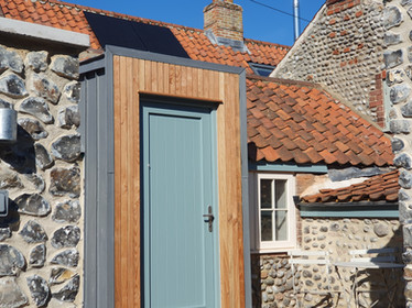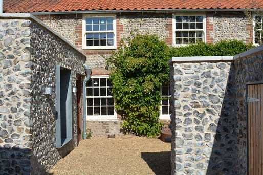 At Alston Architects, we were commissioned to sensitively transform a historic cobble-fronted fisherman’s cottage in the heart of Cley-next-the-Sea, North Norfolk. The project includes a hand-knapped flint utility extension to the front, a full internal renovation of the main cottage and detached annex, and extensive garden landscaping that anchors the buildings into the surrounding coastal terrain.